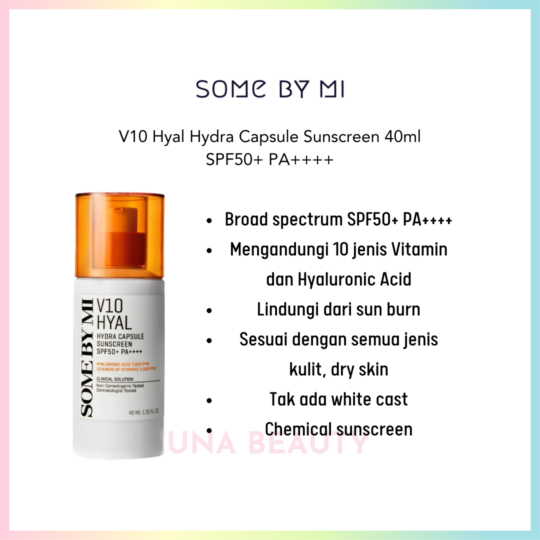 Η SOME BY MI V10 Hyal Hydra Capsule Sunscreen SPF50+ PA++++ είναι ένα αντηλιακό με χημικά φίλτρα που προσφέρει ισχυρή προστασία από την υπεριώδη ακτινοβολία (UVA και UVB), ενώ παράλληλα ενυδατώνει και αναζωογονεί την επιδερμίδα.